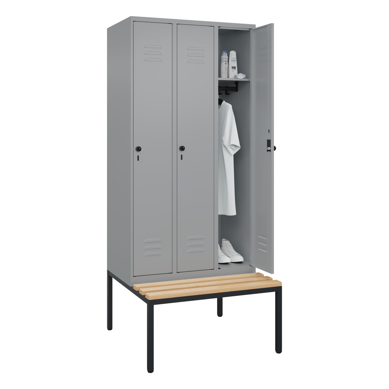 • schmale Seitenkanten für homogene Optik wenn mehrere Spinde nebeneinander aufgestellt werden, ohne Doppelungen an den Spindstößen